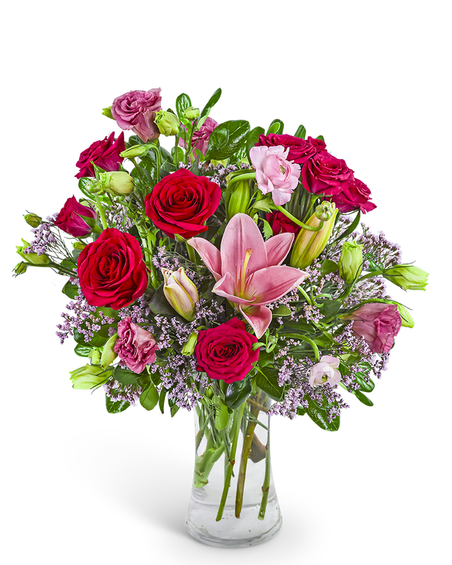 Flirty Mood is a beautiful mix of Roses, Lilies, Ranunculus, and seasonal textures in a rich palette of pink and red. Designed in a clear vase, it's a great pick for birthdays, anniversaries, or just because flower delivery. Substitutions may be made based on availability while preserving the overall look of the arrangement.