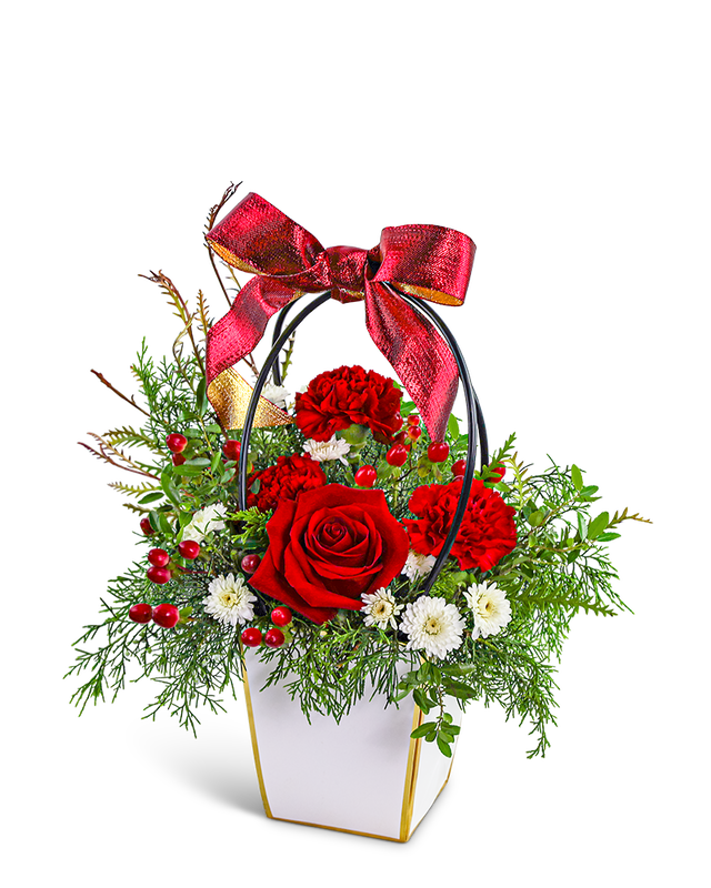Holly Hugs Tote is a festive holiday arrangement featuring Roses, Carnations, Button Mums, and Christmas foliage, all tied together with a shimmering ribbon accent. Designed in a sleek tote-style container, it's the perfect flower delivery to spread seasonal cheer.