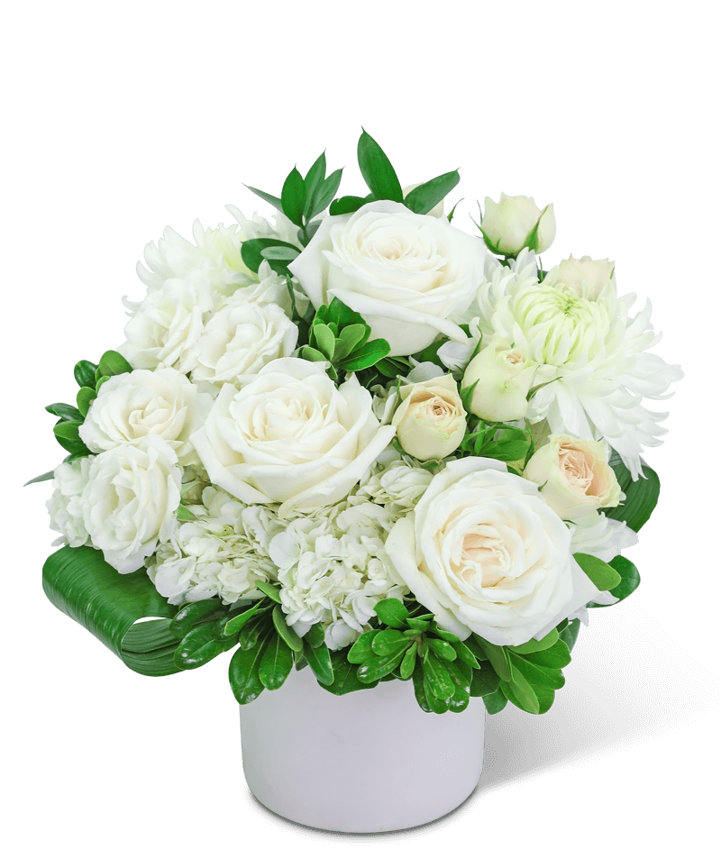 Our stunning cream and blush flowers are long-lasting and the perfect gift for any occasion. Traditional roses, contemporary mums, and playful hydrangea mix to create a stunning bouquet! In Vogue is bursting with blossoms and arranged in an eye-catching white vase, accented with premium foliage. A shop favorite, this timeless beauty is perfect for any occasion!
