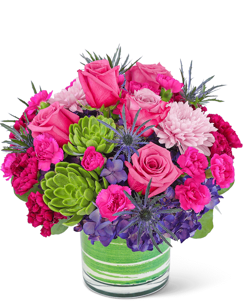 Delight in the rich purple tones of one of our floral favorites, London Luxe with Succulents. A chic, leaf-lined vase with hydrangea, roses, carnations, succulents, and premium foliage makes up this lavish floral design. This vibrant flower arrangement will brighten anyone's day and add a pop of color to any space. It would make a perfect Anniversary or Birthday gift for that special someone.