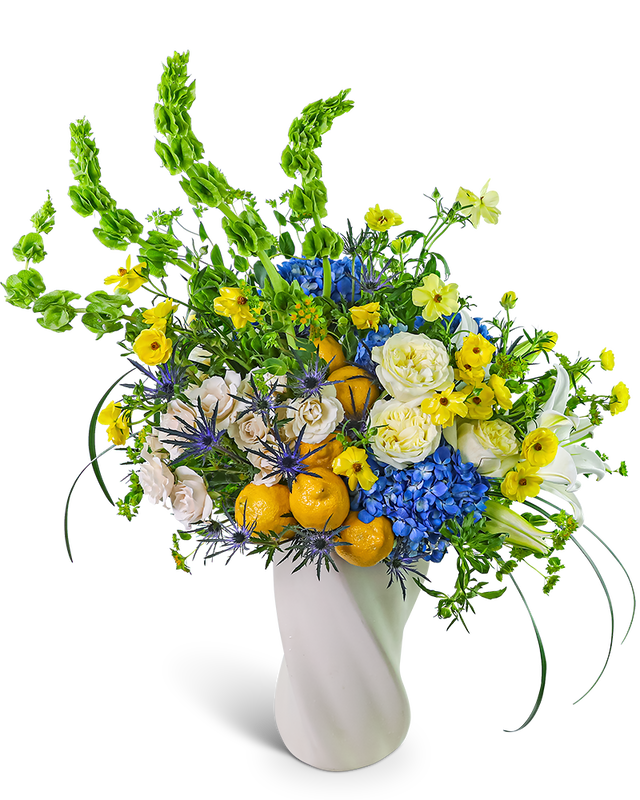 Luna Citrus Couture is a bright and artful mix of Roses, Lilies, Bells of Ireland, and lemon accents in a modern white ceramic vase. This unique flower arrangement is perfect for celebrations, housewarmings, or sending a refreshing surprise with local flower delivery. Our floral designer may make thoughtful substitutions while maintaining the overall look of the arrangement.