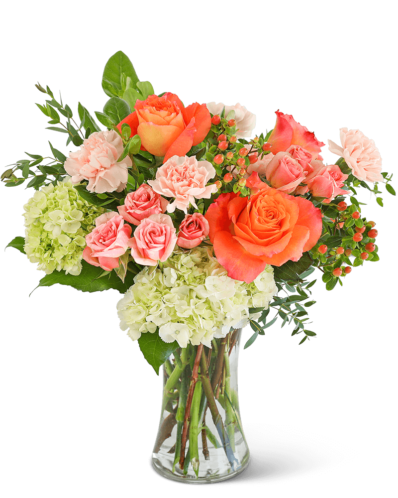 Send a message of love and hope with this beautiful flower arrangement. Brighten someone's day with the Malibu Sun flower design. Its highlighted flowers include Free Spirit Roses, carnations, hydrangea, spray roses, and assorted foliage. A stunning arrangement of fresh flowers is designed to brighten the room and lift the spirit, making someone's birthday or get-well gift extra special.