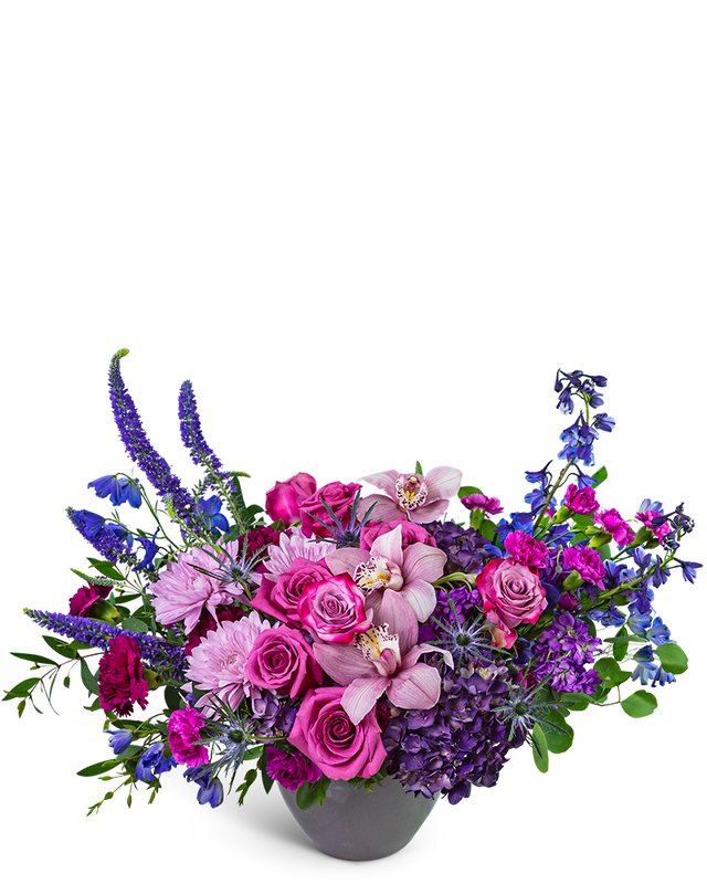 Moonlight in Tahiti is a luxurious blend of Roses, Cymbidium Orchids, Hydrangea, and accent blooms in deep violet hues, arranged in a sleek granite-colored vase. This elegant flower arrangement makes a dramatic centerpiece for celebrations, upscale events, or a stunning flower delivery. Our floral designer may make thoughtful substitutions while maintaining the overall look of the arrangement.