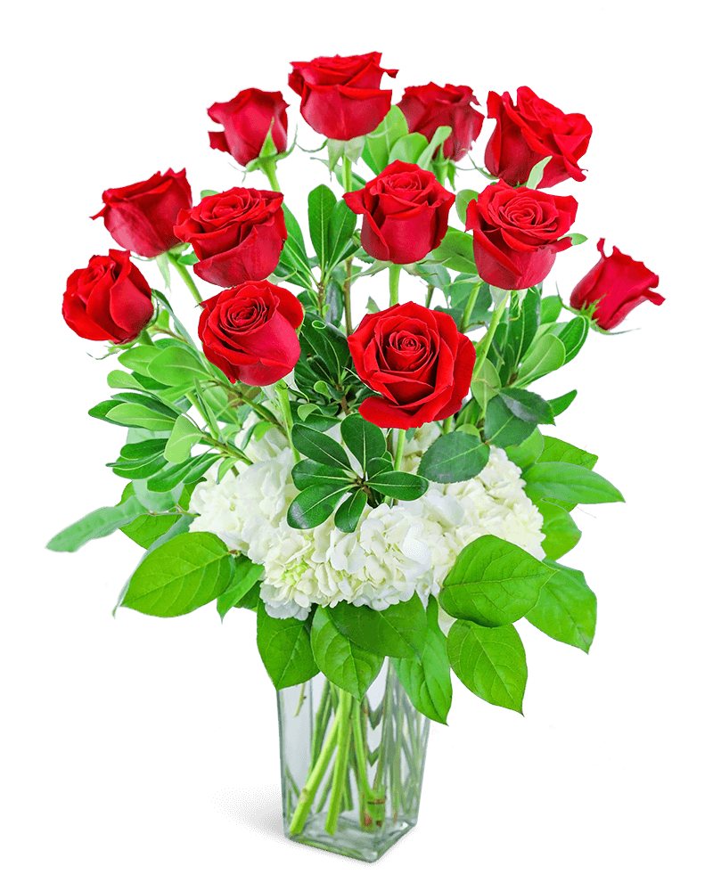 Send the traditional rose bouquet in a modern way! 12 long-stem red roses are artfully designed by our expert florist with this fresh, romantic arrangement featuring red roses, hydrangea, and premium foliage. Our One Dozen Red Roses with Hydrangea is a perfect gift for anniversaries, birthdays, a housewarming gift, Valentine's Day, or any occasion!