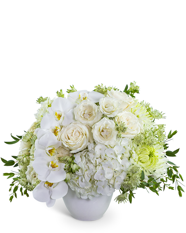Orchid Clouds is a luxurious all-white arrangement featuring Phalaenopsis Orchids, Roses, Hydrangea, and accent blooms. Designed in a modern ceramic vase, it's perfect for sympathy, anniversaries, or a thoughtful gesture of elegance. Our floral designer may make thoughtful substitutions while maintaining the overall look of the arrangement.