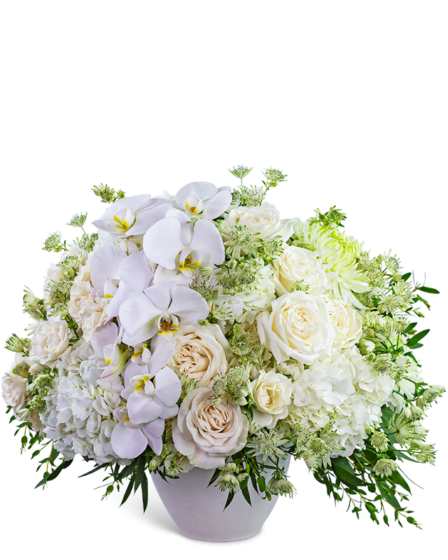 Orchid Couture is a graceful display of white Phalaenopsis Orchids, Roses, Hydrangea, along with other accent flowers and premium foliage. Designed in a white ceramic vase, this luxurious arrangement is perfect for sympathy, weddings, or sending a heartfelt thank you. Our floral designer may make thoughtful substitutions while maintaining the overall look of the arrangement.