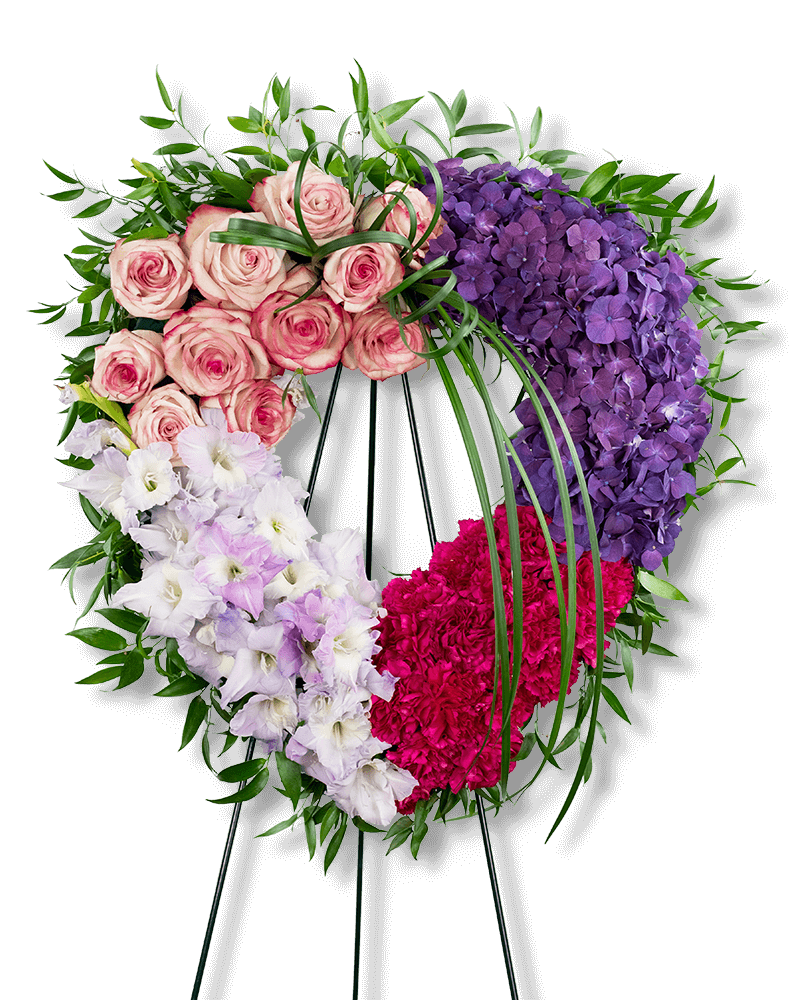 Our Patchwork standing heart spray is a beautiful design with a stunning color blocking pattern in the shape of a heart. Pink roses, bright pink carnations, lavender gladiolus, purple hydrangea, and premium greens make up a meaningful design that would bring honor and beauty to a very special loved one. A deep or hot pink flower can convey gratitude, appreciation, recognition; while a light or pale pink flower conveys grace, gentleness, joy and happiness.