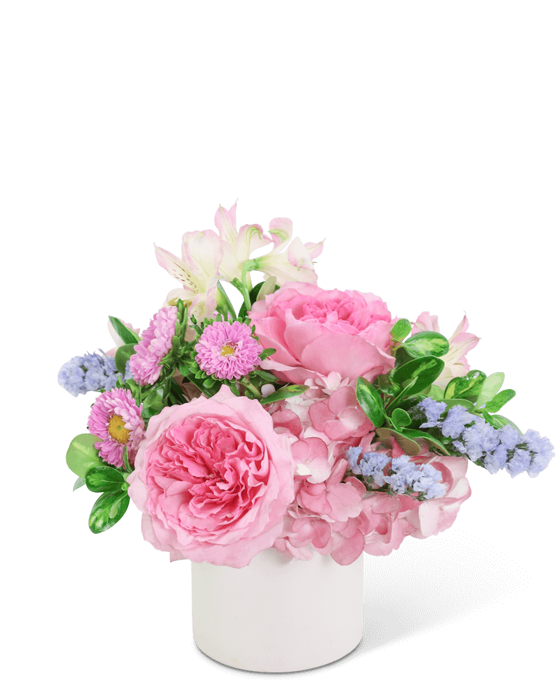 Send your love with this beautiful design, perfect for a birthday, new baby, or anniversary gift. Pinky Sweet features pink roses, Alstroemeria, and Hydrangea designed in a white cylinder for a delicate look that will make anyone smile. This unique flower design adds the perfect extra pop of pastel color! We can offer same-day flower delivery in most cases. If you are sending the bouquet directly to your recipient, please provide the complete address and contact information so that we can deliver the flowers directly to them.