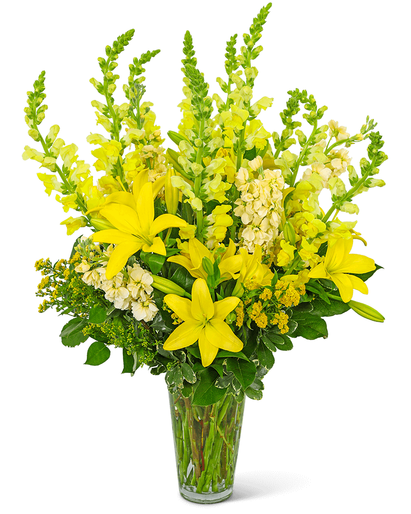 Radiant Meadow is a stunning flower design created to bring joy and vibrancy into any room! Bursting with color, this gorgeous arrangement is sure to brighten anyone's day. This beautiful bouquet features a stunning mix of yellow snapdragons, stock, lilies, solidago, and premium foliage. The combination of colors and textures in this arrangement will leave a lasting impression on anyone who receives it. Whether it's to celebrate a special occasion or simply to brighten someone's day, Radiant Meadow is the perfect choice.