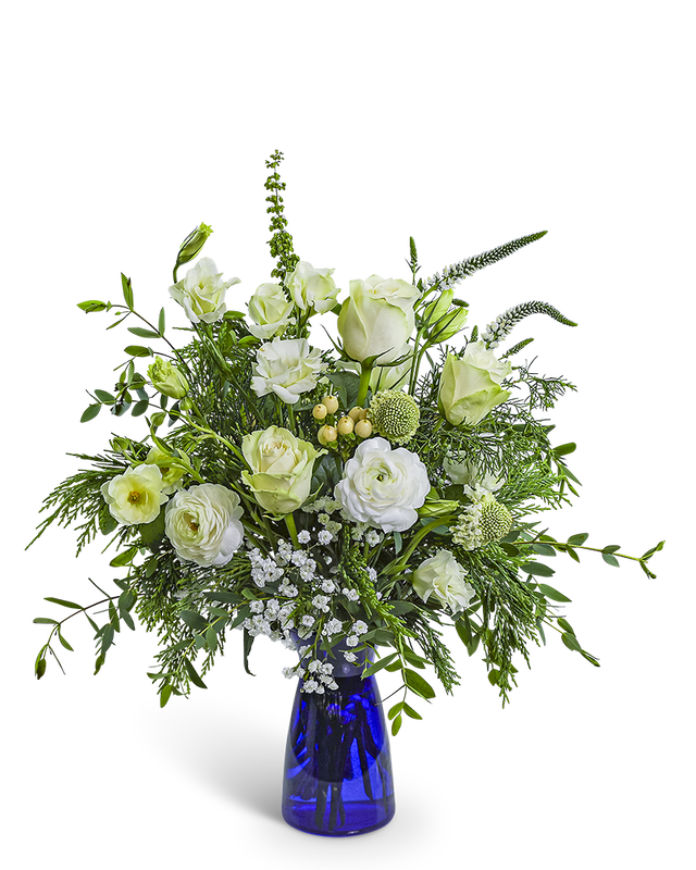 Sapphire Snow is a fresh and graceful white arrangement featuring Roses, Ranunculus, Veronica, Hypericum Berries, Baby's Breath, and winter foliage in a cobalt blue vase. Its light and airy design is perfect for celebrating the season or sending a thoughtful gesture. Flowers and vase may vary slightly based on availability, with thoughtful substitutions made by our floral designer to maintain the overall look and feel.