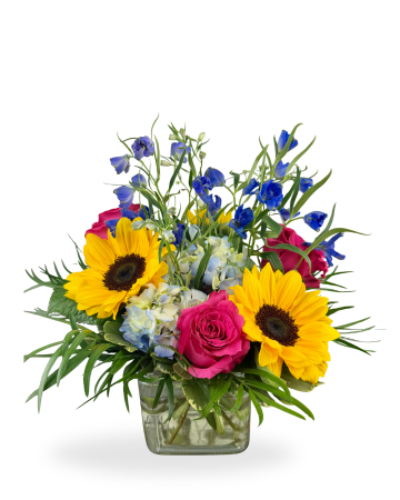 Short on stature, big on fun! Sunflowers and roses accented with blue blooms. Perfect for a desk or coffee table.