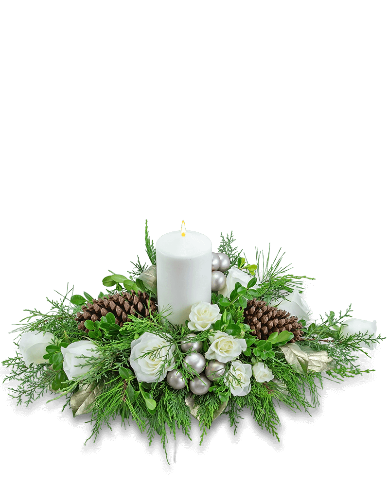 Spread the glow of the season with this delightful centerpiece. Starry Night features roses, pinecones, and ornaments with assorted evergreen and foliage surrounding a white pillar candle. This festive arrangement will light up any space!
