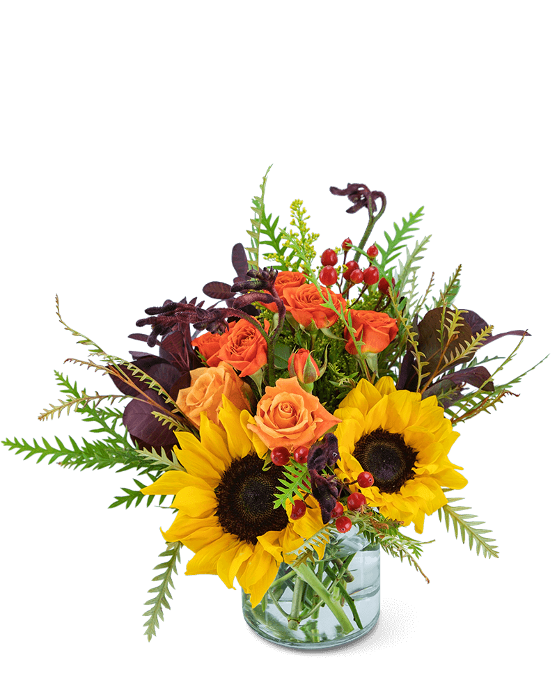 All the colors of a new day are captured in Tuscan Sunrise. This sun bright arrangement features roses, sunflowers, kangaroo paw, hypericum berry, solidago, leucodendron, and grevelia. Whether celebrating a birthday, new baby, or retirement, this bouquet will add just the right touch of warmth.